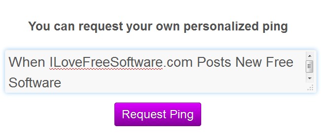 Alerts in this free online content change notification service are called pings. Each new ping allows you to setup new text triggers with the help of which searches are gonna be conducted online and results posted back to you.