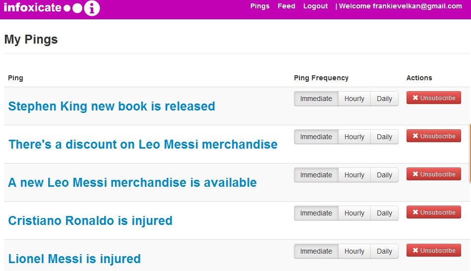 Infoxicate.me has a lot of popular pings sorted in categories which were setup by other users. They range from sports, music, news, technology to things like surfing. As soon as they’re selected, new alert updates will start being posted in your feed.