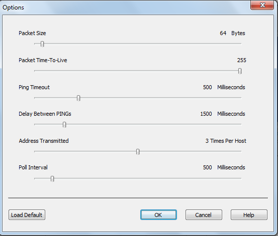 For changing the preferences and the options of the program you would have to click on the options from the Menu Bar, doing so pops out a new window with options of increasing and decreasing on it. The options listed for modification include the changes for packet size, ping timeout, Display between each ping, and much more.