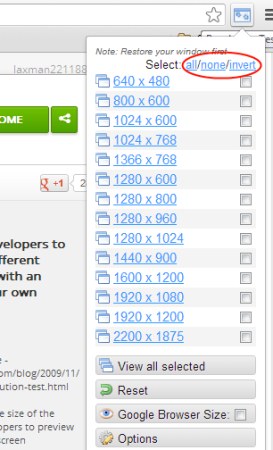 Other options are also available at above (all, none, invert) in this pop up window to select all resolutions, invert the selection, etc. Perform actions accordingly. Likewise you can also view a specific resolution or all the available resolutions using Google Browser Size option.