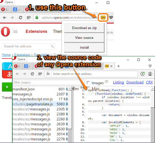 This is really a fantastic extension to find the source code of any Opera extension. It is also available to find the source code of Chrome extensions. Using this extension, you can download the zip file of any extension and also view the source code and other files without installing a particular extension. It also provides an option to download the CRX of any extension that can be used later when needed.