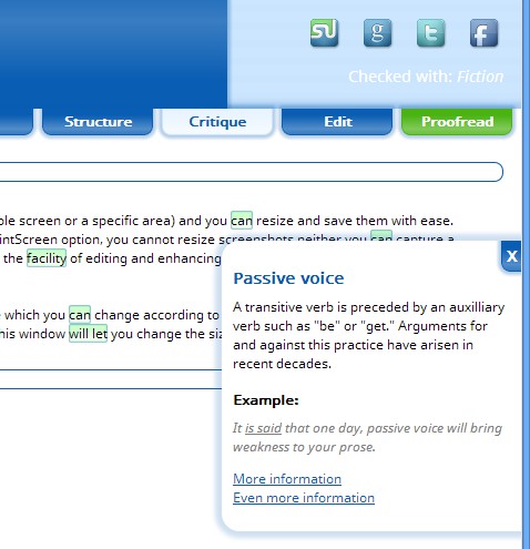 Slick Write for Chrome is a free Google Chrome addon that lets you easily proofread text for a wide range of stylistic errors. It is created by the very popular website that bears the same name. You can, for example, check your text for passive voice, check for excessive use of adverbs, word structure and flow, and much more. This proofreading extension for Chrome makes it easy to check any website text right away by simply selecting it from inside the text box where it’s being typed.