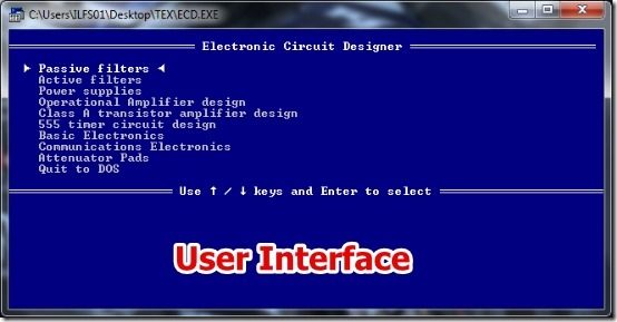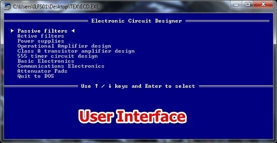ECD is very simple to use. All you have to do is select the Text Option for Video Graphic mode and then select the type of the circuit you are working on. Input the values of prompted components and that’s all. You will have the calculated circuit’s component values instantly.