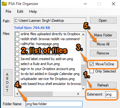 Step 4: List of files of that particular extension will be in front of you. Now enable MoveToOne option. After this, an option to create a folder will visible on the bottom of its interface. You can give a name to that folder.