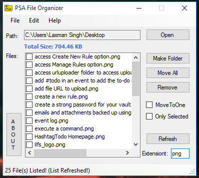 PSA Folder Organizer is a free software to automatically move a particular type of files, from a folder or location that contains many other types of files, to the specified folder. It can come in really handy to automatically organize the downloaded files to the folders of your choice. For example, let’s say your Downloads location contains MP4, PDF, MKV, TXT, and other types of files. Together they create a mess. But using this software, you can move MP4 files to one folder, PDF to other, and so on in a matter of seconds. Manually, it can be boring and time-consuming of course, but this software ease this task.