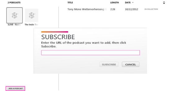 Podcasts: This media player automatically syncs all the podcast media on your hard drive. You can also add new podcasts and download them by choosing the add option and just simply enter the URL of your favorite podcast website as shown below: