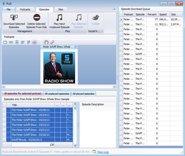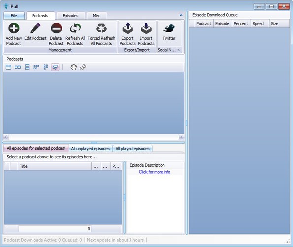 This free podcast downloader has a very feature rich interface. Top left corner has tabs where similarly to newer versions of Office, you can switch between podcast management options (for managing podcasts), episode management (for managing individual episodes) and lastly the miscellaneous tab where you can for example sync downloaded podcasts with your MP3 player, smartphone and so on. List which you can see all the way on the right is the download queue.