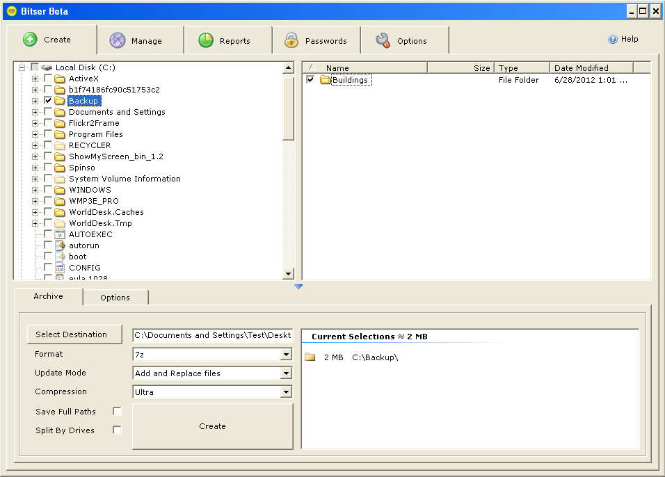 On the image above we can finally see the default interface of Bitser. Notice at the top that it has Beta in its name, that’s because the program is still in development, but despite of that this free archiver worked just fine for us, without any kind of problems. Click Create in the top left corner, find and select the files and folders that you’d like to add to the archive and then at the bottom of the application select what kind of format the created archive is gonna have, from the three that were previously mentioned.