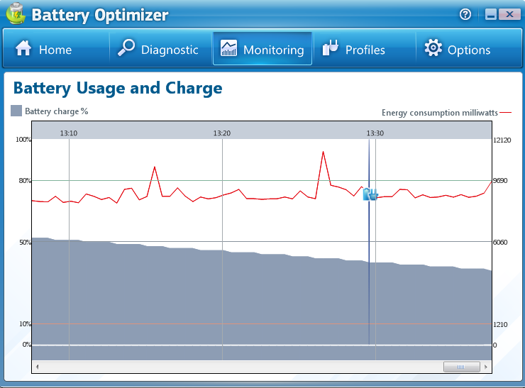 Before starting the diagnostic process you must make sure that the laptop is unplugged from any external power source. Click on the “Begin Diagnostic” button and the process starts. In the monitoring tab you can have a look at the current consumption of your battery. This is shown in percentage.