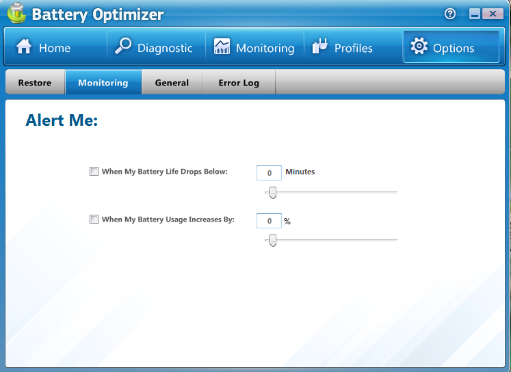 The restore option will enable you to save the original settings or set a new profile. In the monitoring tab within the options tab you can select the time when you want to get alerted about the condition of your battery and get alerts about the extra usage of your battery. The general tab enables you to select the language, select whether you want the software to start with windows, etc. The error log is the tab that lets you send details about the errors you face while using the software.