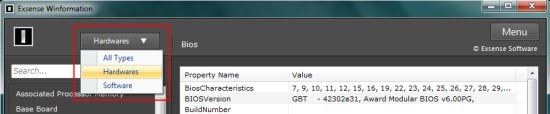 These components are divided into two categories: hardware and software, which you can select from the drop down on top of the program window.