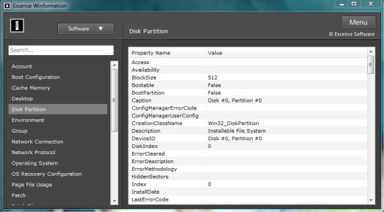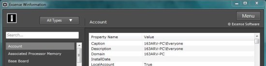 Winformation categorizes all Windows components in two different categories (software and hardware) and provides detailed information on various system components including BIOS, CD ROM, CPU, RAM, hard disk, motherboard, graphic cards, audio/video devices, network adapters, sound cards, operating system, user accounts, etc.