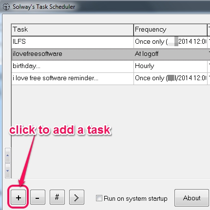 Solway’s Task Scheduler is a simple software that helps to open multiple applications at scheduled date and time. You can add a list of tasks on its interface that you can execute immediately (one by one) or can set a particular date and time to run them. Thus, unlike other task reminder software, you can execute applications automatically as well as set an event reminder (if you don’t want to run applications). For each task, you can set start time, start date, end date (optional), and period (to run the task hourly, weekly, only once, every 5, 10, or 30 minutes, at log off, at shutdown etc.).