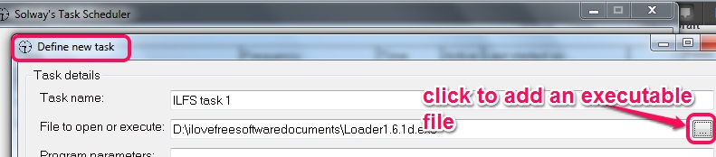 - Address of executable file that you want to run on scheduled date & time. Use browse button to add the file available on your PC that you want to execute. You can even leave this field blank if you just want to use the task as an event reminder.