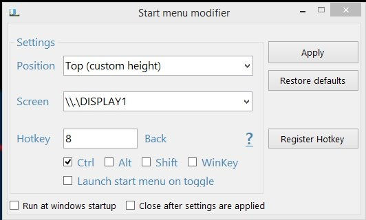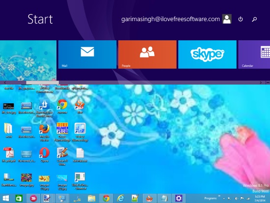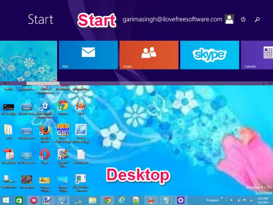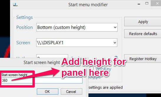 Start Menu Modifier is a free desktop software for Windows 8. This software lets you access the Windows 8 Start Screen from the desktop. Whenever you hit the Windows button, instead of redirecting you to the Start Screen, it will open the Start screen in the upper half of desktop (as shown in screenshot below). You can even set the position of the panel at Top or Bottom. You can also specify the height of the panel, as per your preference.