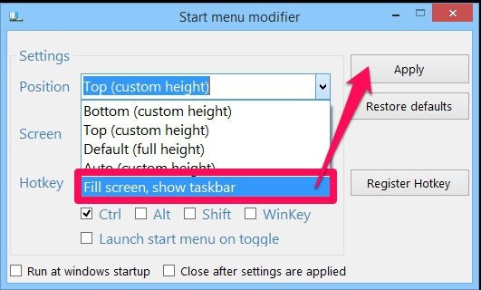 To add Taskbar to the Windows 8 Start Screen, go to the Position Settings again. From the drop down list, choose “Fill screen, show taskbar”. Then click on “Apply” to save changes.