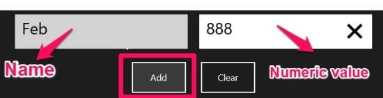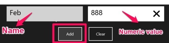 • Just start entering the name of a value and it’s numerical value as pointed out in the screenshot below, hit the Add button, in order to add it to the graph, and in this manner you will build a bar graph of the data that you did input. This data input area is located on the bottom part of the app window.make bar and pie charts in Windows 8 with SeeData