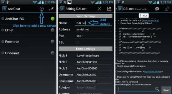 AndChat is one of the coolest looking Android IRC client with its awesome retro UI, which feels like you are using IRC in a terminal application. To add a server just click on the add button, fill up the details, and save it. After that the server will come up in the server list and you can connect to it by clicking on it.