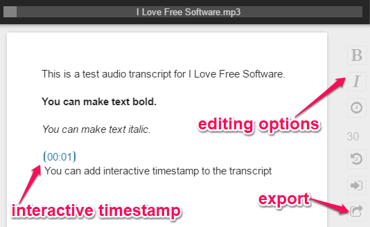 oTranscribe is probably one of the best online audio transcription websites using which you can easily transcribe audio to text online. It allows you to upload an audio file of different file formats like MP3, OGG, WAV, etc. depending on your browser. Then you can play the audio online and type the transcript as you listen to it. The text editor is like a simple notepad with only two formatting options “Bold” and “Italic”. But, one of the best features of “oTranscribe” is that it allows you to insert interactive timestamps in the text editor while writing the transcript. It also lets you export the transcript as markdown or text file. Apart from letting you transcribe audio, it also allows you to import video files to this website for transcription.