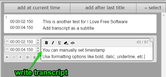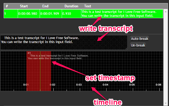Subtitle Edit is another simple subtitle editor which can be used to create audio transcription online. Similar to Subtitle Horse, this one also allows you to upload videos (MP4 and WebM) only for transcribing the audio of the videos into text. You can import a video using a video URL from anywhere on the web. As per the website, you can also import video files from your PC, but I was unable to do so. After importing a video file, you can use the “Subtitle” option to start writing the transcript. It also allows you to manually add timestamps on the transcript. The built-in video player comes with simple controls like “go back 3 seconds”, “go back 100 milliseconds”, etc.