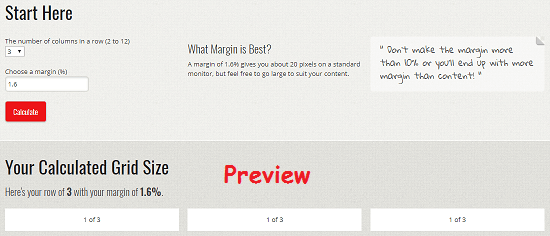 Grid Calculator is the last free CSS grid layout generator in my list that you can try. Just like most of these websites, you can design a grid and then get the CSS and HTML code. But here also it lets you specify number of columns only to create a grid layout. And while creating a layout, you can specify the margin between each column. It generates a preview of the final layout as well that you can analyze. And along with the preview, it leaves the HTML as well as CSS code on its interface. You can simply copy the code and then use it wherever you want. It generates a neat CSS code and it is shorter than some of the websites that I have already listed above. And like all the above websites, you are not required to sign up for this tool. Just access its homepage from the above link and then create the desired layout by specifying the corresponding options. Simple as that.