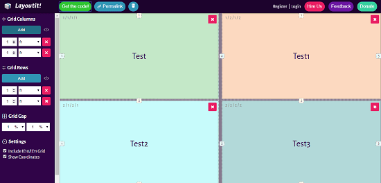 Here are some free CSS grid layout generator websites. These websites let you generate a custom grid layout by specifying different parameters. You can specify the various parameters to generate webpage layout and then get the final output as HTML and CSS code. These websites mainly use CSS code to design the grid layout and produce a preview of the final layout as well. On most of these websites, you don’t even have to sign up to create a grid layout. Just specify the different parameters and get the code of the webpage grid in CSS format.