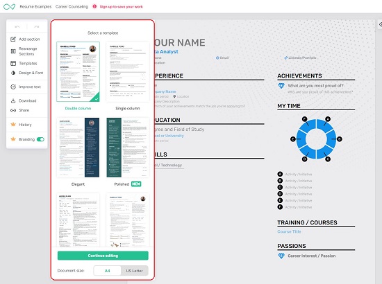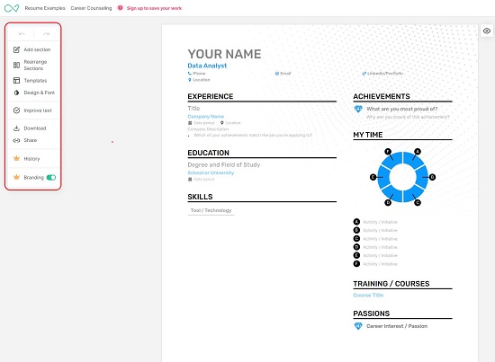 You can easily create visually appealing resumes with help on the content as well as the choice of the right design and layout of the resume. Just click on the link that we have provided below, specify your Name, Job title and select an appropriate resume template to start with. This will take you to the main resume builder screen where all the important sections on the CV are already added such as Summary, Experience, Education, Skills, Achievements and more.