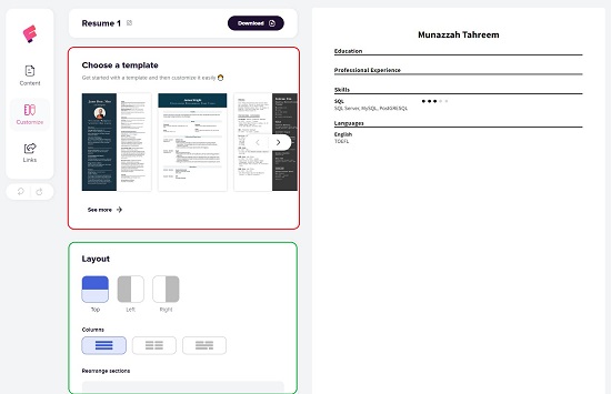 You can use the left panel to add more sections, rearrange existing ones as well as configure the design and fonts. Once you are through with the content and formatting, just click on the ‘Download’ link and download the ATS friendly resume in PDF format. Alternatively, you can also send a copy of the resume to your email address.