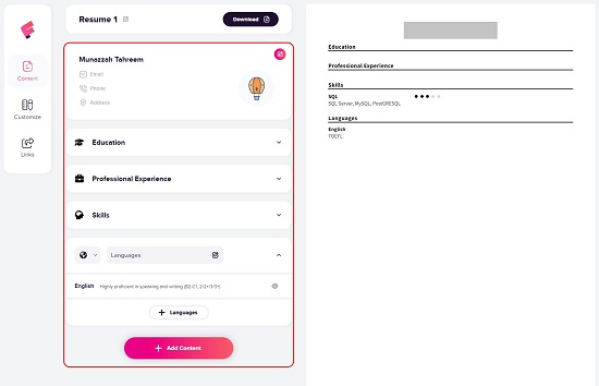Now, click on the ‘Customize’ button in the toolbar on the left and select any resume Template. Next, click on ‘Add Content’, and add all the sections that you require in the resume such as Education, Professional Experience, Skills, Languages, Course, Awards and more and like earlier, click on each section and fill in all the relevant details.