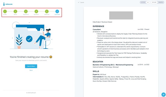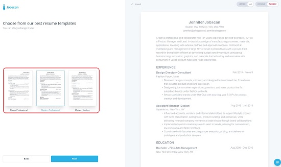 Simply click on the link provided below to navigate to Jobscan Resume Builder, and click on ‘Build My Resume’. Choose any resume template such as Classic Professional, Modern Professional etc, click on ‘Next’ and in the pages that follow, fill your Personal details, Experience, Education, Achievements, Awards, and more. Once you have filled up all the mandatory information, you can download the ATS friendly resume in DOCX format and further edit it in Word if required.