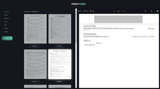 Just click on the link that we have provided below and click on ‘Make New Resume’. At the outset, choose a template from the ones that are available by clicking on the button below the template thumbnail. You can click on the thumbnail itself to view the template in its actual size. Next, click on the resume section links in the panel on the left and fill in all your relevant details as required. Finally, click on the ‘Make’ button to create your resume which will be displayed on the right half of the screen.