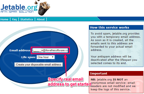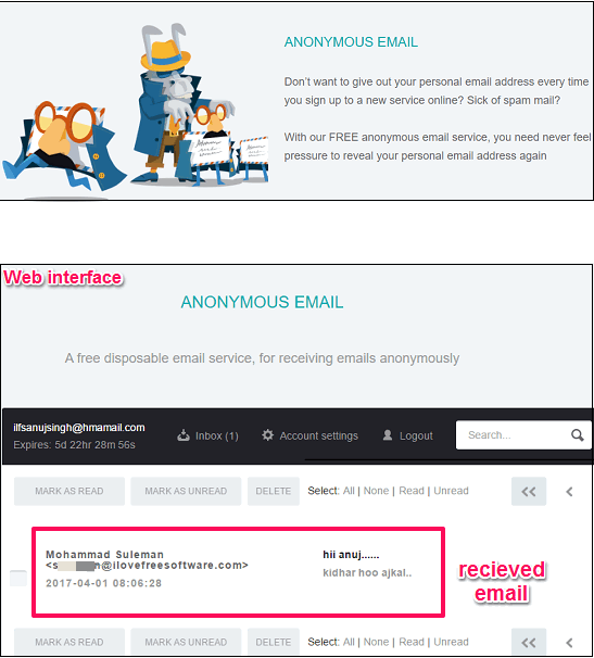 To use Anonymous Mail, you will have to register on their main website and specify your real email address. And after the successful authentication process, you will able to use this service. The service allows you to specify a desired local part for the temporary email address. All the emails which are received by it can be shown on its web interface.