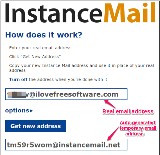 Instance Mail is another free email forwarding service that offers you a temporary email for up to 120 days. You can use this service for registering on various forums and websites and get rid of the fear that they will spam your inbox. It doesn’t let you choose a desired temporary email address, but automatically creates one for you. And you can create many temporary emails to use.