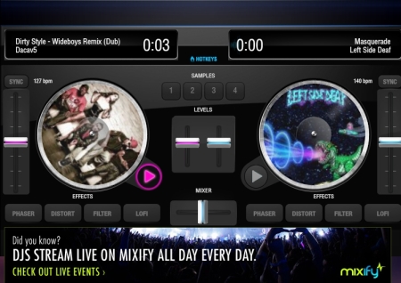 The next free online DJ mixer website is Mixify. It has an easy set of tools with some interesting options to check out. You can begin with browsing thousands of songs available on Mixify and SoundCloud. Once you have found the right songs, you can drag them on the decks. Once the songs have been added, you can add sound effects to them and also use the features like vinyl scratching. The songs can also be downloaded and shared on platforms like Facebook, Twitter. There is also one events options; you can create your own events or join other DJ’s in their events.