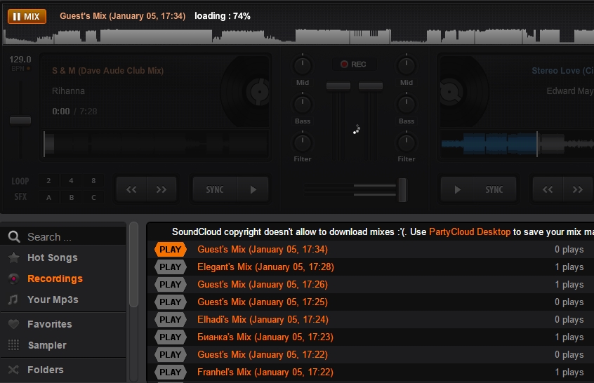 The last online DJ mixer that you can read about in this article and use for free is partycloud. The website boasts of having a database of over 20 million songs that you can mix. It has a very good-looking deck with all the necessary features that you may require. There are categories like Hot songs, Recordings ( wherein your mixed songs are stored), Favorites ( wherein your favorite songs are kept), and more.