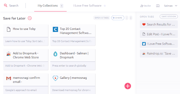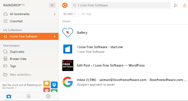 Raindrop is another free online team bookmarking service which you can use to collaboratively create and manage bookmarks. It lets you bookmark web pages with the help of a browser extension that is available for Chrome, Safari, Firefox, and Opera. You can also collaborate on the bookmarks by inviting participants to the collections you create. The participants can view, edit, and add new bookmarks. This one also allows you to create as many bookmarks as you want and add them to the collections. There is also no limit on the number of collection and participants whom you can invite.
