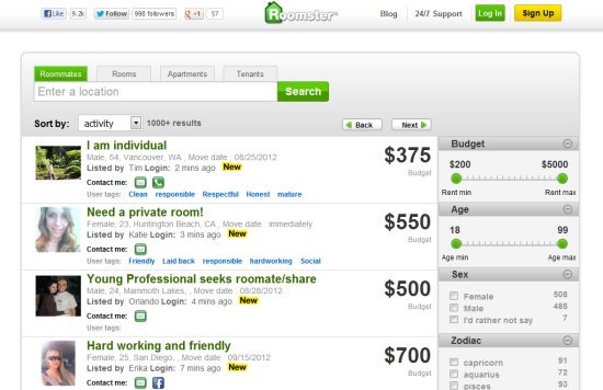 Roomster is another free service that let’s you find roommates, rooms and apartments. You can easily search for roommates by hitting the Roommates tab on the website and clicking the view more option within the roommates section shows you the results in a more informative way. Enter your preferred location in the location search bar and press the Enter key on the keyboard or click the search button, and in no time it shows you all the results which you can further sort on the basis of your budget, age preference, gender preference, and Zodiac sign preference. For contacting members of this service, you need to simply register yourself by providing some basic information. Registration allows you to directly send messages to any of the Roomster members.
