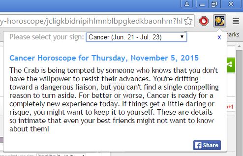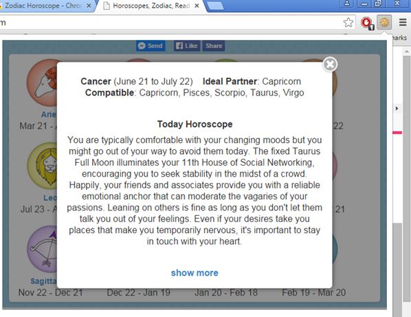Small drawback of this horoscope extension is that you’re not given the entire horoscope within the notification/top right corner drop down. Only a small portion of it is showed with a “Read more” link to a web page where the full horoscope can be read.