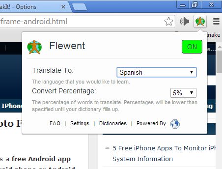 You’ll have to add the English language to the extension manually by opening up settings. Once you’ve done that, open up a webpage in your native language and set Flewent to translate only about 20% of words to English. This will help you learn English by combining both it and your native language in one text. English words can have their meaning revealed on mouse hover. As you learn more words, increase the percentage of words that are translated by the extension.