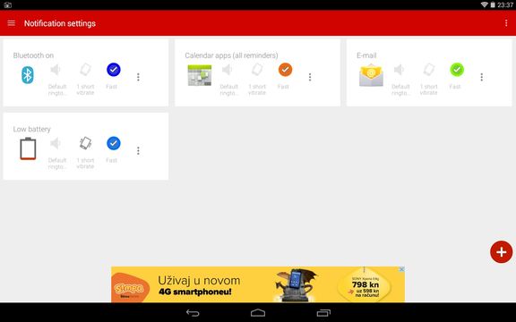 What it lets you setup are basically profiles for different apps, hardware toggles and also contacts. By hardware toggles I’m referring to things like bluetooth status, battery fullness, etc. For each profile you can setup LED notification (and a color of your choice), audio ringer and also vibrate settings. Not all apps are supported, but all the basic ones like SMS, call and email notifications work just fine with it.
