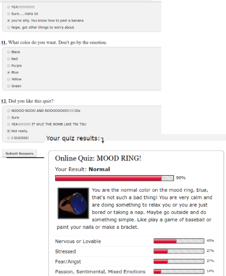 Online Quiz: MOOD RING (Homepage) is good enough to find out your current mood. It provides 12 questions and based on your answers it shows if your mood is normal, you are feeling nervous, stressed, passionate, or fear. Not all the questions are actually good (I find a few questions stupid) but I guess this is how the website helps to check your mood.