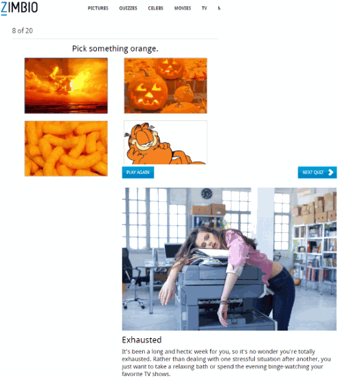 Zimbio comes with a different idea to check mood online. Instead of presenting questions and their answers, it brings a quiz which provides 18 steps. In each step, there will be four different pictures. Based on what is prompted on each step, you need to select a picture. When the quiz is completed, it shows if you are exhausted and need a break, feeling low, anxious, etc.