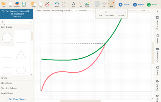 LucidChart is another fully-fledged online diagramming tool where you can easily make phase diagrams. Unlike Draw.io, this tool only has one line shape which is fully customizable. From the shape toolbar, you can select and add this line to the canvas. To customize the line, simply select it and LucidChart will show you all the customization options on the top toolbar next to text formatting options. From there, you can make the line type to curved or sharp-angled. You can change the line width, style, and color as well. This way, you can make any type of phase diagram here.