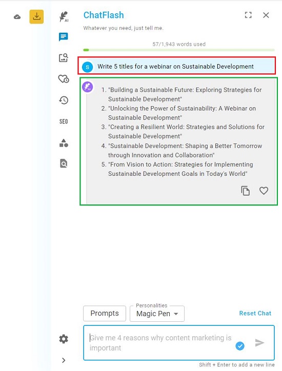 Like the earlier tool above, you must now specify the prompt for creating the titles and then hit ‘Enter’ on your keyboard. You can use the same example that we have suggested above and mention the topic in a few words at the end of the command. In just a few seconds, you will be able to view the titles for your webinar in the side panel. Click on the ‘Copy’ icon to copy all of them to the clipboard and choose one of them that best suits your requirements.
