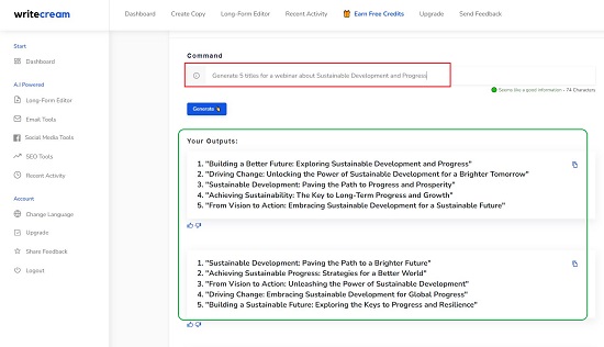 You will now be navigated to the main dashboard where you must specify the command for generating the webinar titles such as ‘Generate 5 titles for a webinar about [topic]’ where you must mention the topic at the end of the command in a few words. Now click on the ‘Generate’ button and hold on for a few seconds after which the titles will be displayed on the screen. You can click on the ‘Copy’ icon to copy them to the clipboard, edit them if required and use them as your webinar title.