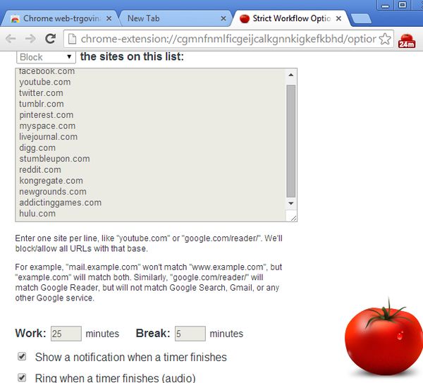 On top of acting as a pomodoro timer extension, Strict Workflow also blocks popular websites during work sessions to help you stay focused on the task at hand. When countdown finishes, you can be notified with both audio and video notifications. Work and break intervals can also be customized.