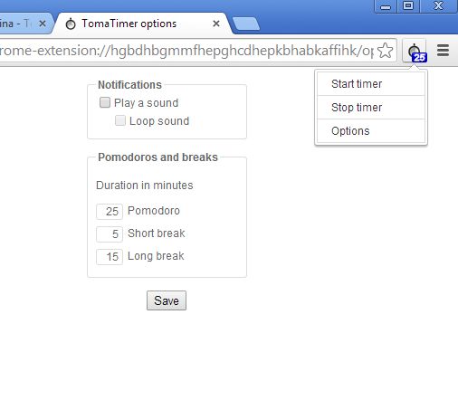 Previously mentioned Simple Pomodoro extension shows you time that’s left for the current session graphically, Pomodoro on the other hand has a numerical timer that counts down not just minutes, but also seconds. When the timer reaches 0, you’ll be notified so that you can start your break.