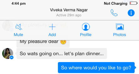 You can see that there is an icon at extreme top right corner that offers you info about the current conversation. Tap on it to Mute friend, Add friends to conversation, Check profile, and check photos shared in conversation. The mute friend option lets you mute all notifications for current conversation.