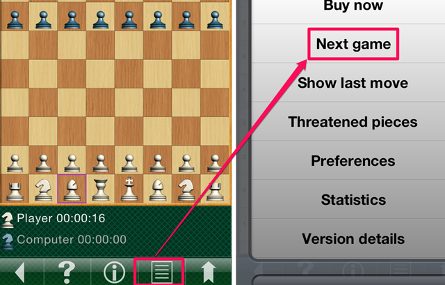 You can download the Chess V game either by searching on the iTunes App Store or by clicking on the link given at the end of this review. Whenever you launch the game, it automatically starts a match against computer. You can continue to play that game, or you can play a custom match by quitting the match. To quit the match, tap on the note style icon (marked in screenshot below) and select Next game option from the pop-up menu. When you quit the game, you will see the options to customize the match according to your wish.