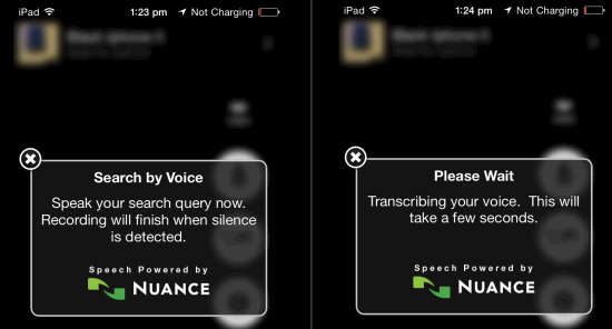 - Speak: If you want to search by speaking, then click on Speak icon. This will bring up a pop-up bubble. Now, start speaking whatever you want to search. The app will process your voice automatically and will display the result accordingly. If you want to make changes to your search query, then you can either go back to speak it again or simply make the edit by entering text in text box.